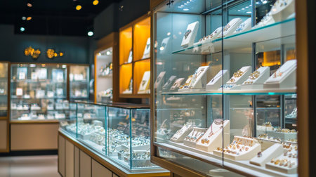 A luxurious jewelry display in a modern boutique, featuring sparkling necklaces, rings, and bracelets in illuminated glass cases with warm, soft lighting.