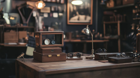 A stunning interior of an antique display room showcasing vintage collectibles and exquisite timepieces, reflecting luxury and ornate craftsmanship.