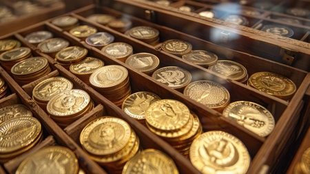 Assortment of vintage coins and trinkets scattered on an antique table, evoking history, nostalgia, and antique collecting.