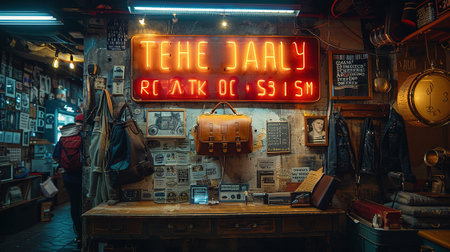 Vintage market stall filled with an assortment of products, including packaging, books, and crafts, evoking a nostalgic and charming atmosphere.