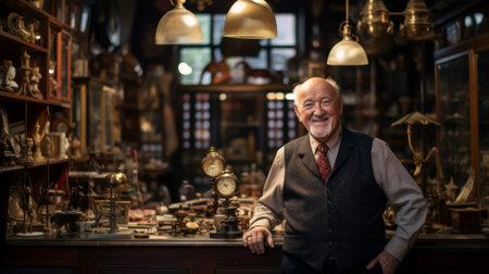Quaint antique shop scene dealer with ornate furniture and delicate porcelain
