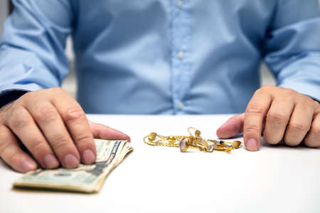 Sell gold jewellry, pawnbroker with us dollars in the hand, sale and buying
