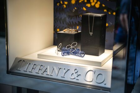 Milan, Italy - September 21, 2018: Tiffany store in Milan. Montenapoleone area. Fashion week Tiffany shopping.