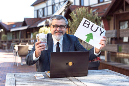Young businessman holding huge amount of money. New ukraine UAH banknotes 1000 and 500 in the hands of a businessman. Profit.