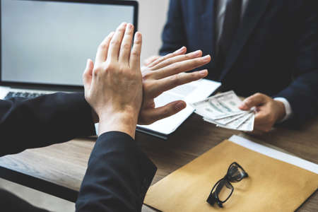 Anti bribery and corruption concept, Business man refusing and don't receive money banknote offered from business people to accept agreement contract of investment deal.