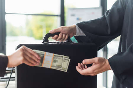 cropped view of blurred woman with dollars near man with briefcase, anti-corruption concept