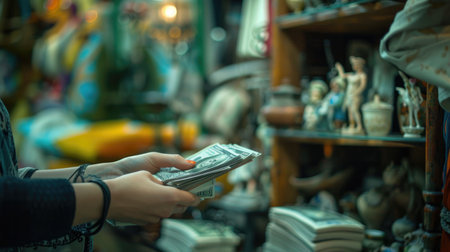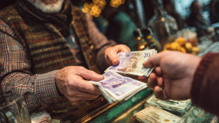 A vibrant scene depicting a cash transaction at a bustling bar, featuring hands exchanging various currency notes, highlighting the warmth of human interaction.