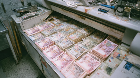 A cluttered workbench displays stacks of cash, highlighting an industrial workshop scene. The image captures the essence of currency production and workspace dynamics.