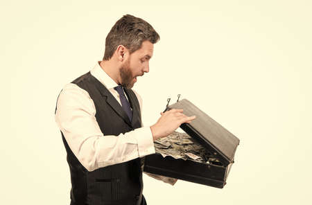 partial view of blurred business partners near man with dollars in briefcase