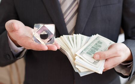 Businessman in suit, tie holds in hands drop of black oil of Brent brand in crystal cube.Pack of hundred dollars bills.Crisis in financial market,falling,rising prices,quotes,changes in exchange rate.