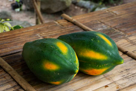 Large papaya fruits native species or local landrace on stall hawker for sale thai people and foreign travelers travel in Baan Huay Nam Sai village valley hill of Suan Phueng in Ratchaburi, Thailand