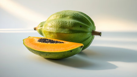 Fresh green papaya and a slice revealing bright orange flesh on a smooth surface under soft light