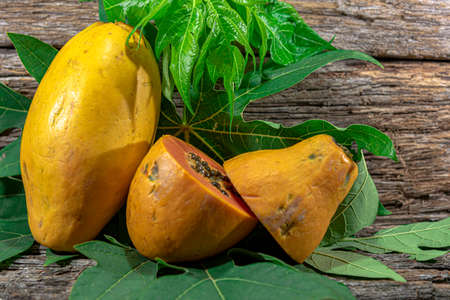 Half cut ripe papaya with seed onon old wooden table with nature background. Natural medicine