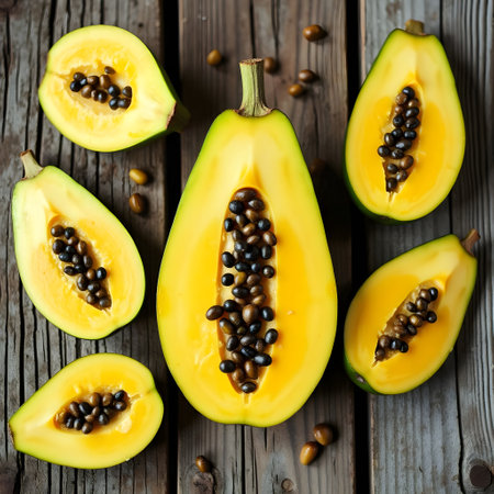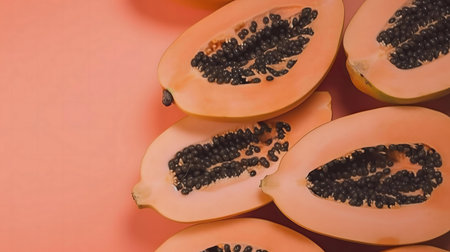 Bright orange papaya halves reveal black seeds, showing vivid colors in a beautiful arrangement.
