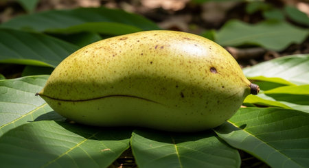 Fresh papaya cut in half, revealing black seeds, placed on lush green tropical leaves. Vibrant colors reflect tropical fruit concept.