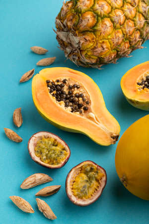 Ripe cut papaya, pineapple, melon, passion fruit, almonds on blue pastel background. Side view, close up. Tropical, healthy food, vacation, holidays concept.