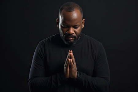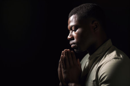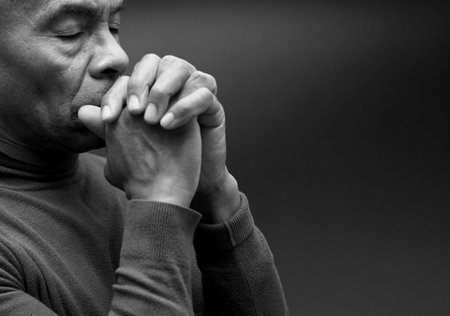 Black man praying deeply, hands together, showing faith, hope, belief, and connection with spirituality in a personal moment of worship.