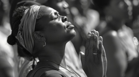 A woman peacefully prays with closed eyes to express gratitude on Juneteenth.