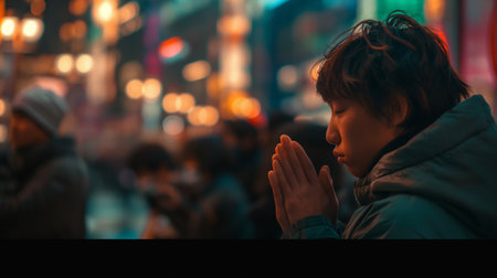 Asian boy praying in the night at Chinatown, New York City.