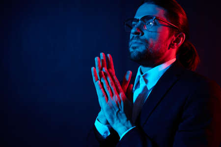 Latin American man prays to god on dark studio background. Cinematic effect
