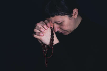 Woman praying with her head bowed with folded palms on a black background.
