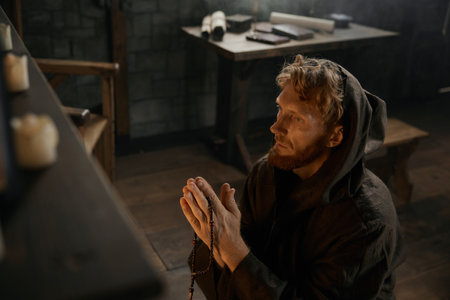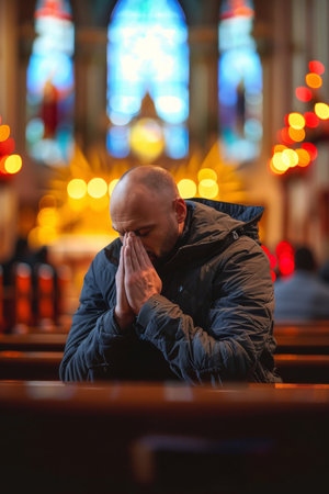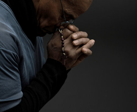 Soulful prayer: a man in quiet devotion, hands clasped around a rosary cross, seeking solace and spiritual connection, capturing the essence of serene contemplation, faith, and religious devotion