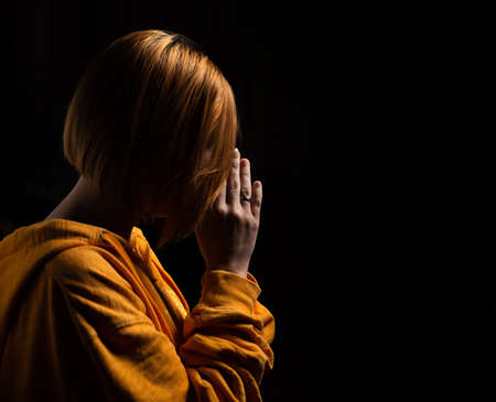 Religious young woman praying to God, on dark background.