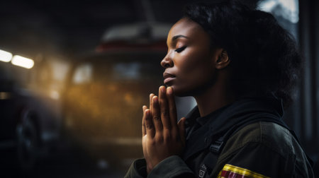 Firefighter praying. Safety, protection, faith and religion concept