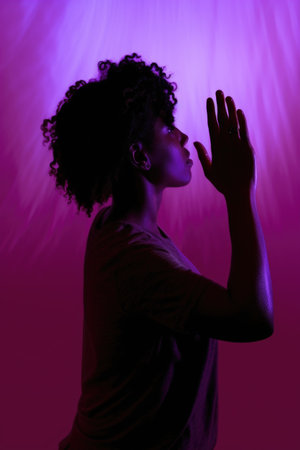a Young African American Woman Praying: A young African American woman kneeling in prayer with closed eyes and a serene expression, her hands clasped together in devotion. The studio background is a deep purple, symbolizing spirituality and introspection