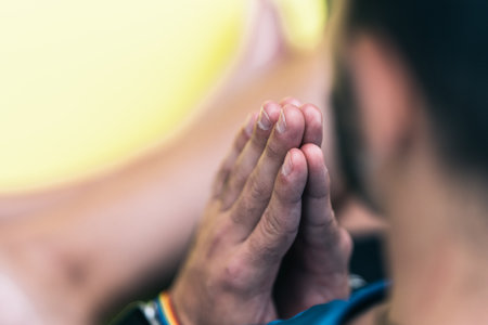 A close-up view of hands in prayer, adorned in a traditional yellow robe, set against a dimly lit background, capturing the essence of spiritual devotion.