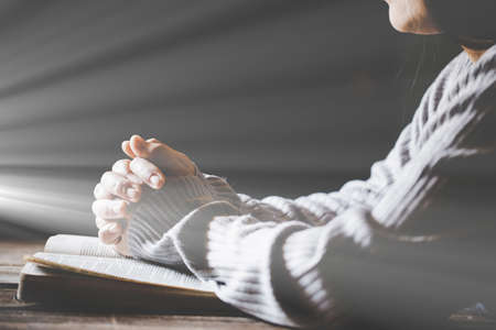 Christian life crisis prayer to god. Woman Pray for god blessing to wishing have a better life. woman hands praying to god with the bible. begging for forgiveness and believe in goodness.
