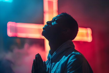 Young black man praying in front of a red and blue stage lights