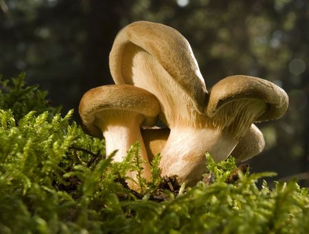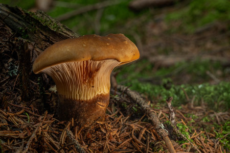 The mushrooms in needles lit with the sun. Mushrooms at a tree trunk in the wood. Close up, selective focus