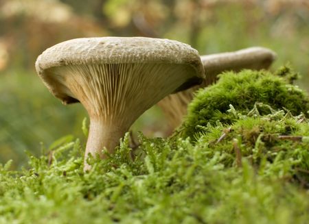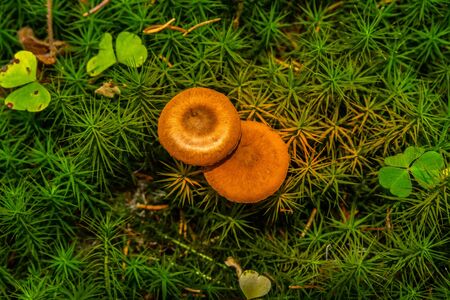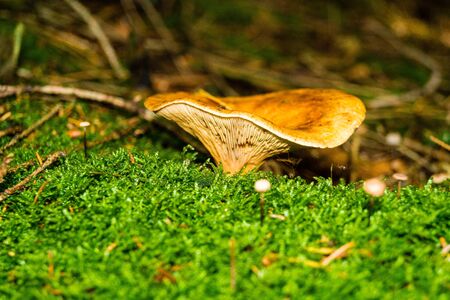 Small mushroom in a forest on green moss with dry leaves. Macro photo shoot of nature.