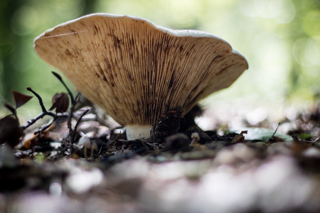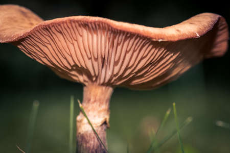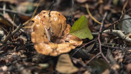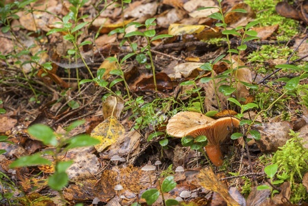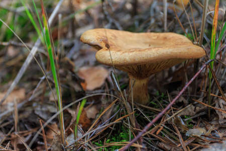Closeup of edible mushroom peppery milk-cap on forest floor