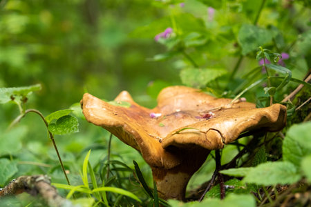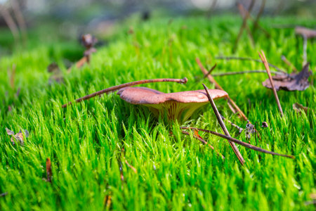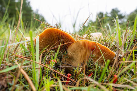 Wild-grown mushroom in a forest. Rufous milkcap also known as the red hot milk cap mushroom. Close-up