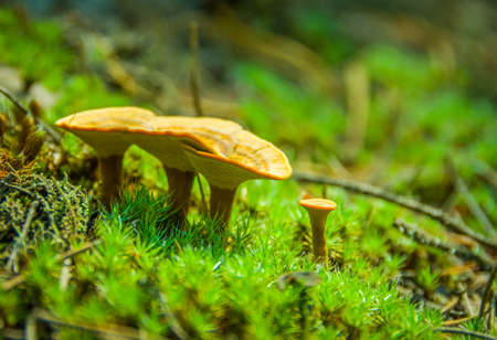 The orange mushroom a coral milky cap growing in wood an autumn season, sunny day
