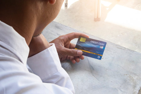 Men hold credit card with bokeh background