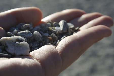 a childs hand on the background of asphalt. Little childrens fingers touch rocks on the ground.