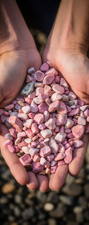 A person holds a handful of gravel, showcasing the texture and size of the construction material. The focus is on the gravel and the hands holding it.