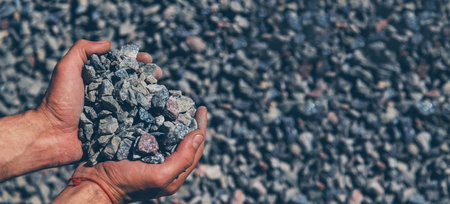 The man holds the rubble in his palms. Pieces of random granite rocks. Close-up. Selective focus. Outside the room. Tinting. Monochrome.