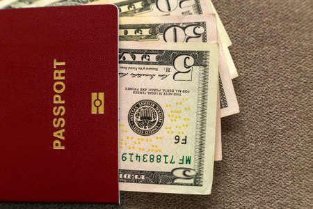 Travel passport and money, American dollars banknotes bills on copy space background, top view. Traveling and finance problems concept.