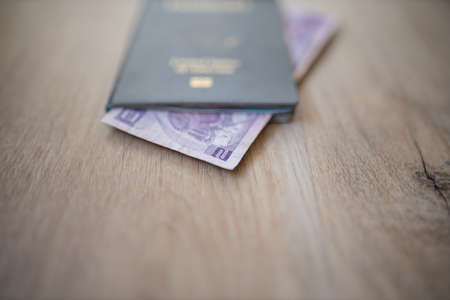 International passport with airline boarding pass and money for travel, yellow office desk and table top view
