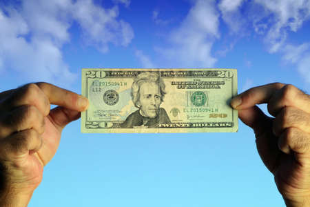 two man's hands holding a twenty dollar bill against a blue sky