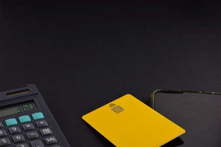 On black background, credit card, calculator and cell phone. Technological concepts.