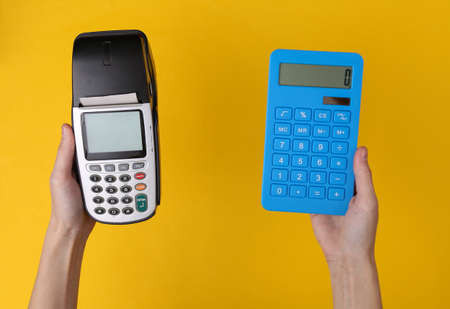 Hand holds payment terminal and calculator on yellow background. Payment for purchases