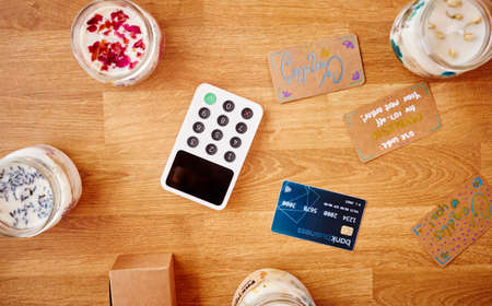 Overhead Shot Of Homemade Boutique Candles And Credit Card Payment Terminal