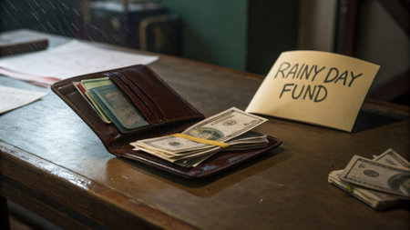 An open wallet overflowing with cash alongside a small note that reads Rainy Day Fund..