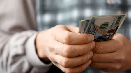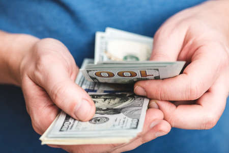 Male hands counting US Dollar bills or paying in cash. Pay expenses.