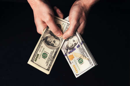 Male hands holding us hundred dollars banknotes. Man with american money closeup on black background